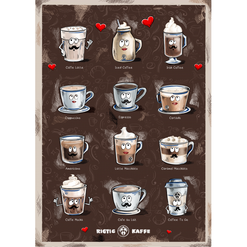 Rigtig Kaffe Coffee Drinks plakat byder på 12 velkendte og lækre kaffe- & mælkedrikke, så du altid får inspiration til den næste kop.