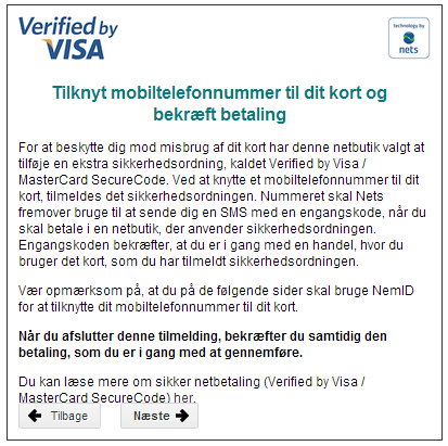 Første gang du møder 3D Secure og/eller Dankort Secured by NETS skal du tilmelde dit mobilnummer, så koden sendes til den rigtige telefon. Du skal bruge dit NemID til dette: