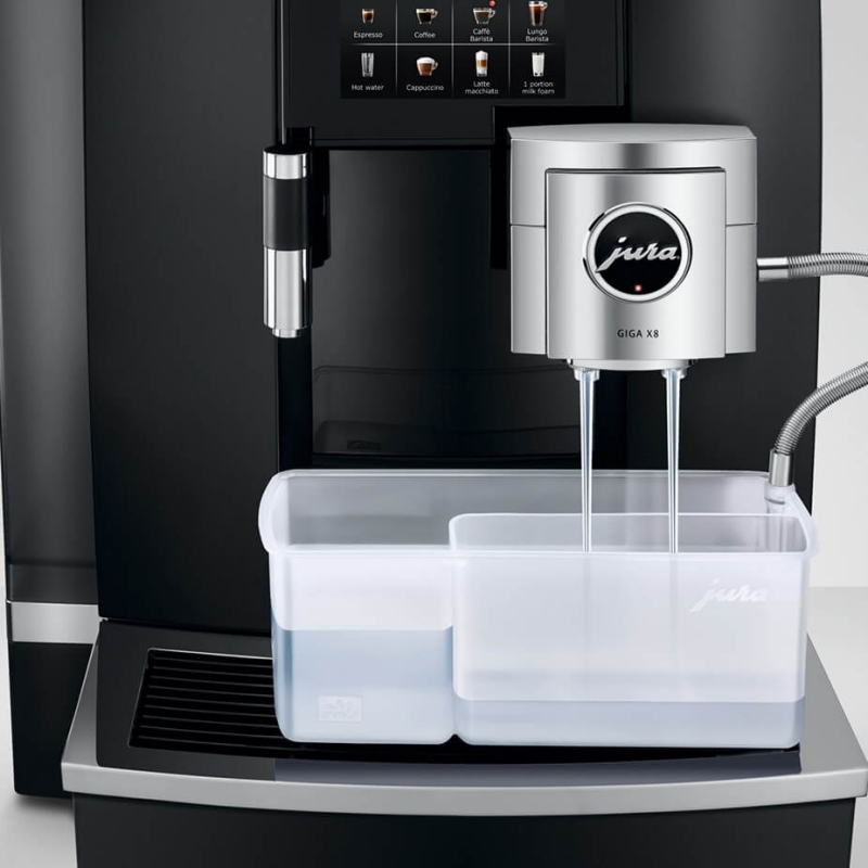 Jura Giga X8 (EA) Alu Black er udstyret med Juras absolut mest avancerede mælkesystem, som blev introduceret i Jura X8. Her kombineres de bedste funktioner fra deres øvrige produktsortiment, så du bl.a. får et mælkesystem, der selv skelner mellem mælk og mælkeskum under brygningen, og som ved et tryk på en knap brygger 1-2 kopper - også med mælk.