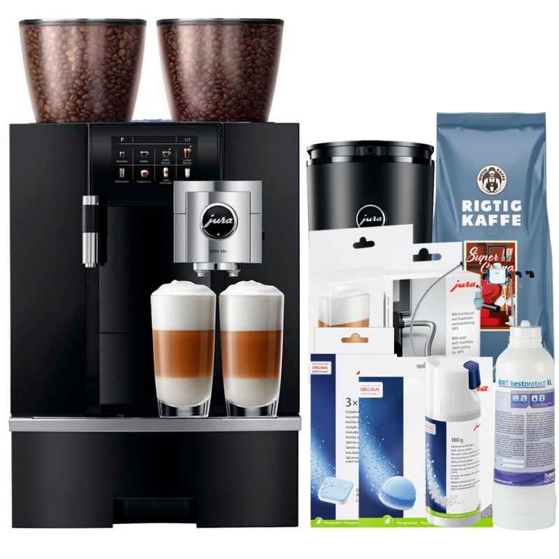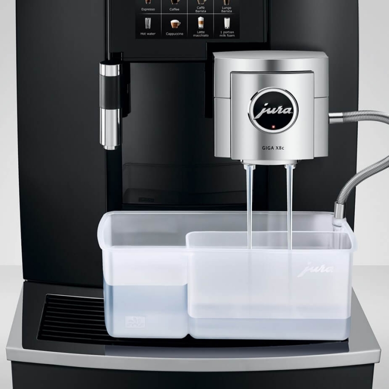 Jura Giga X8c (EB) Alu Black er udstyret med Juras absolut mest avancerede mælkesystem, som blev introduceret i Jura X8c. Her kombineres de bedste funktioner fra deres øvrige produktsortiment, så du bl.a. får et mælkesystem, der selv skelner mellem mælk og mælkeskum under brygningen, og som ved et tryk på en knap brygger 1-2 kopper - også med mælk.
