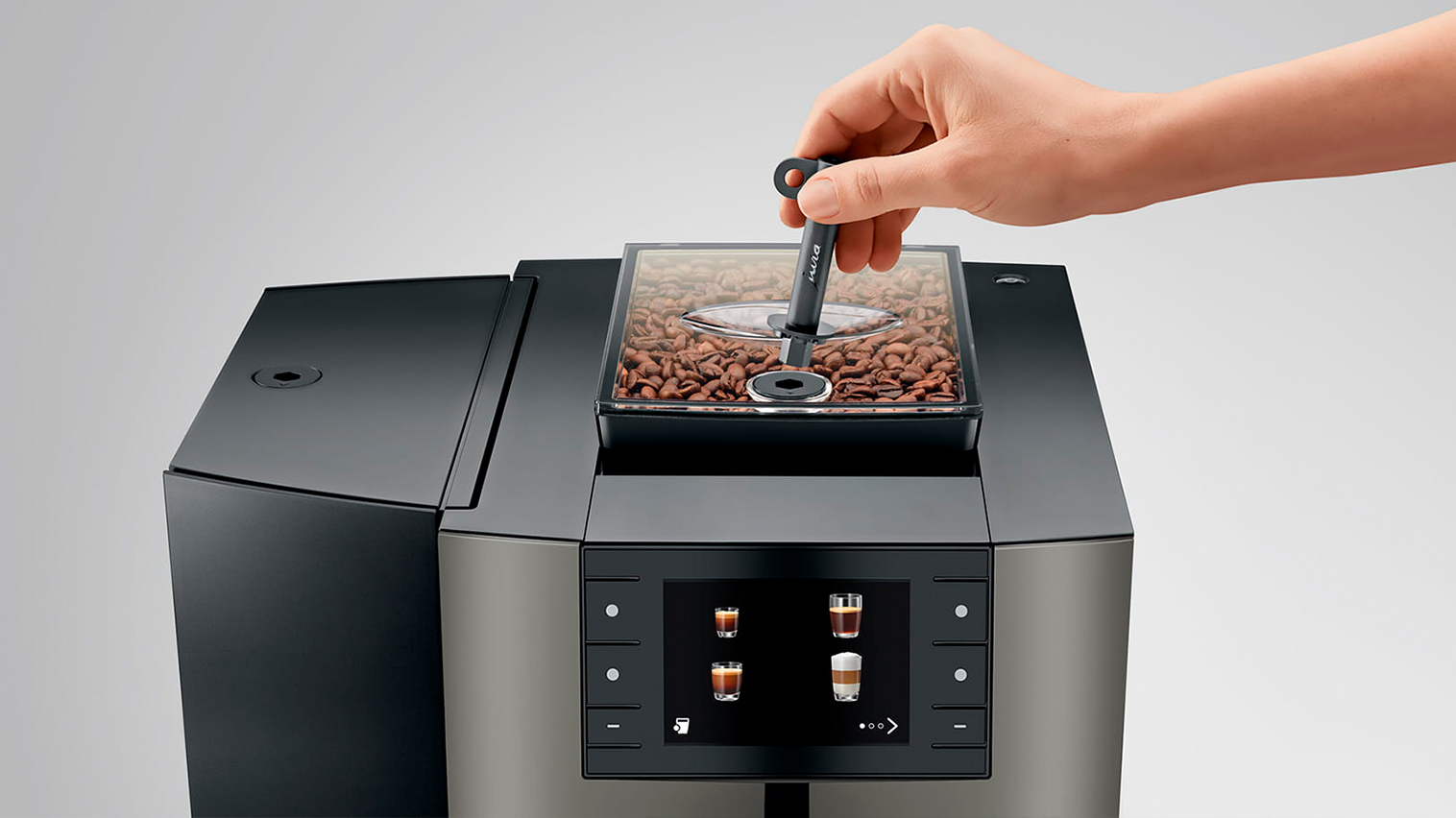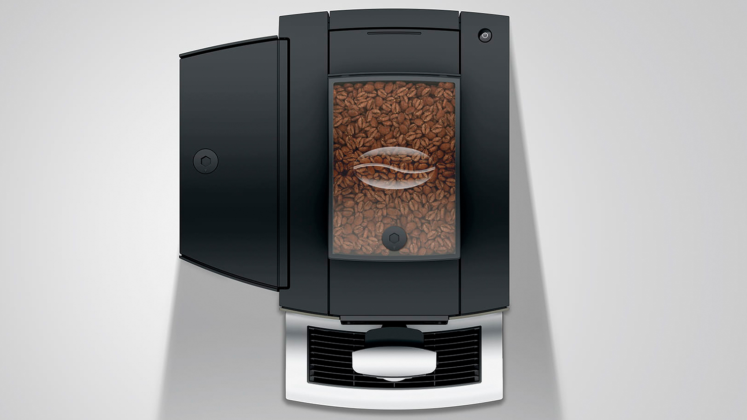 Jura X10 er udstyret med en bønnebeholder med en kapacitet på 500g hele bønner - ønsker du en endnu større bønnebeholder, kan du tilvælge Juras bønnebeholder udvidelse.