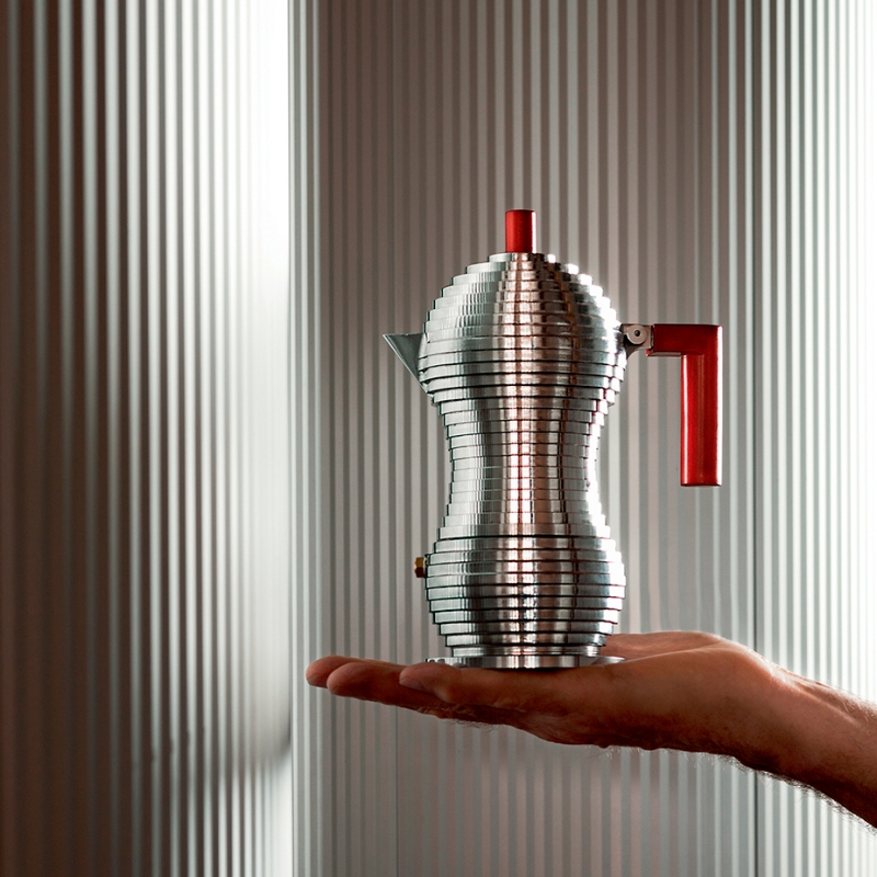 Alessi Pulcina espresspkanden er designet af Michele De Lucchi i samarbejde med Illy kaffe og blev lanceret i 2015. Samarbejdet om at udvikle kanden har taget 15 år og resultatet er en unik og utroligt lækker espressokande!
