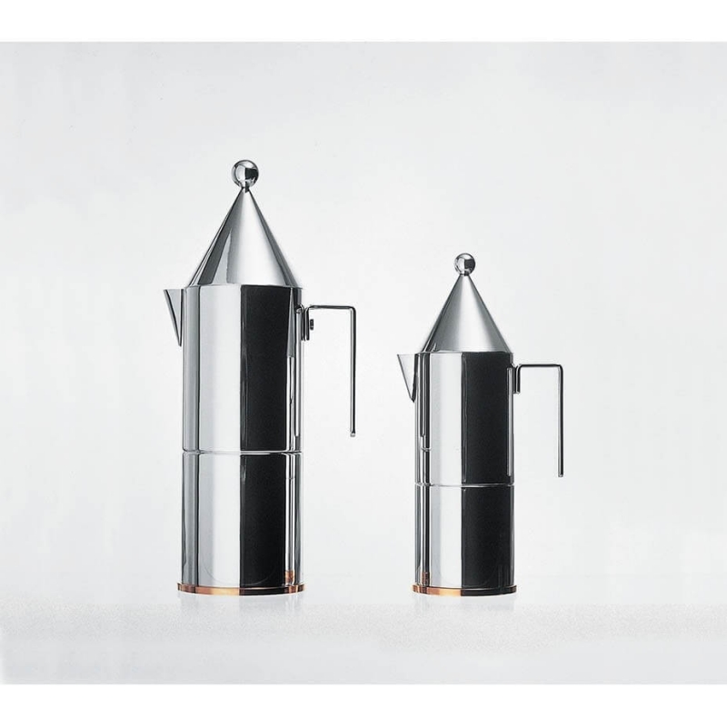 Alessi La Conica er en elegant espressokande i rustfrit stål med kobberbund. Kanden kan rumme 30 cl, svarende til seks kopper, og med det lille runde håndtag på låget har denne espressokande et anderledes og bemærkelsesværdigt udtryk. Kanden er designet mellem 1980 og 1983 af Aldo Rossi.