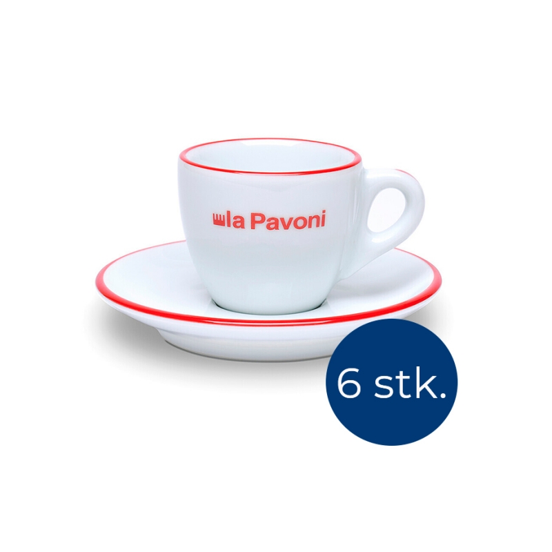 Lækre og elegante espressokopper fra italienske La Pavoni. Espressokopperne er lavet i hvidt porcelæn med røde detaljer og tilhørende underkop. Kassen indeholder 6 kopper med tilhørende underkop.