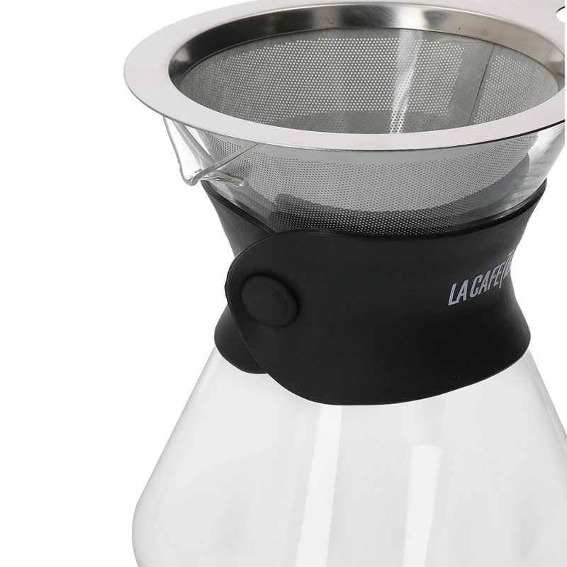 Hoveddelen er lavet af varmebestandigt borosilikatglas, som giver en stærk termisk stødmodstand. Derudover er denne pour over pakket ind med et silikonehåndtag for sikker og nem hældning. Den inkluderer et rustfrit stålfilter med et fint net, der fjerner behovet for et papirfilter, fanger kaffegrumset og filtrerer overskydende olier og uønskede partikler.
