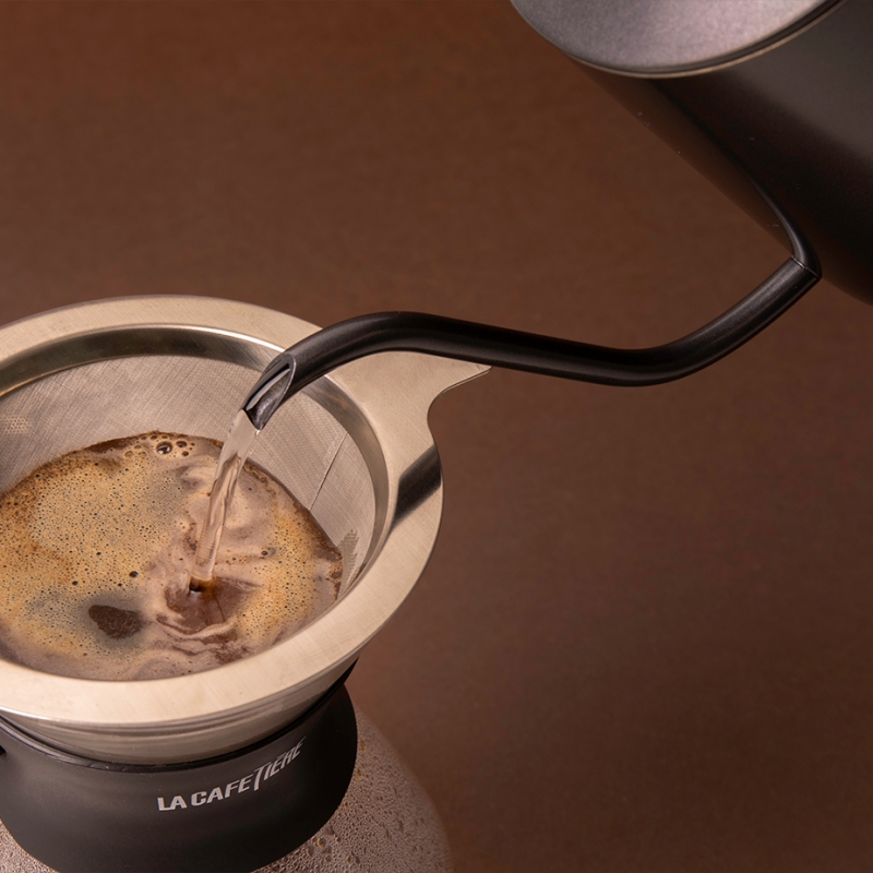 La Cafetière gooseneck i sort er en elegant kedel, og det perfekte redskab til at koge vand til diverse pour-over kaffebrygningsmetoder.