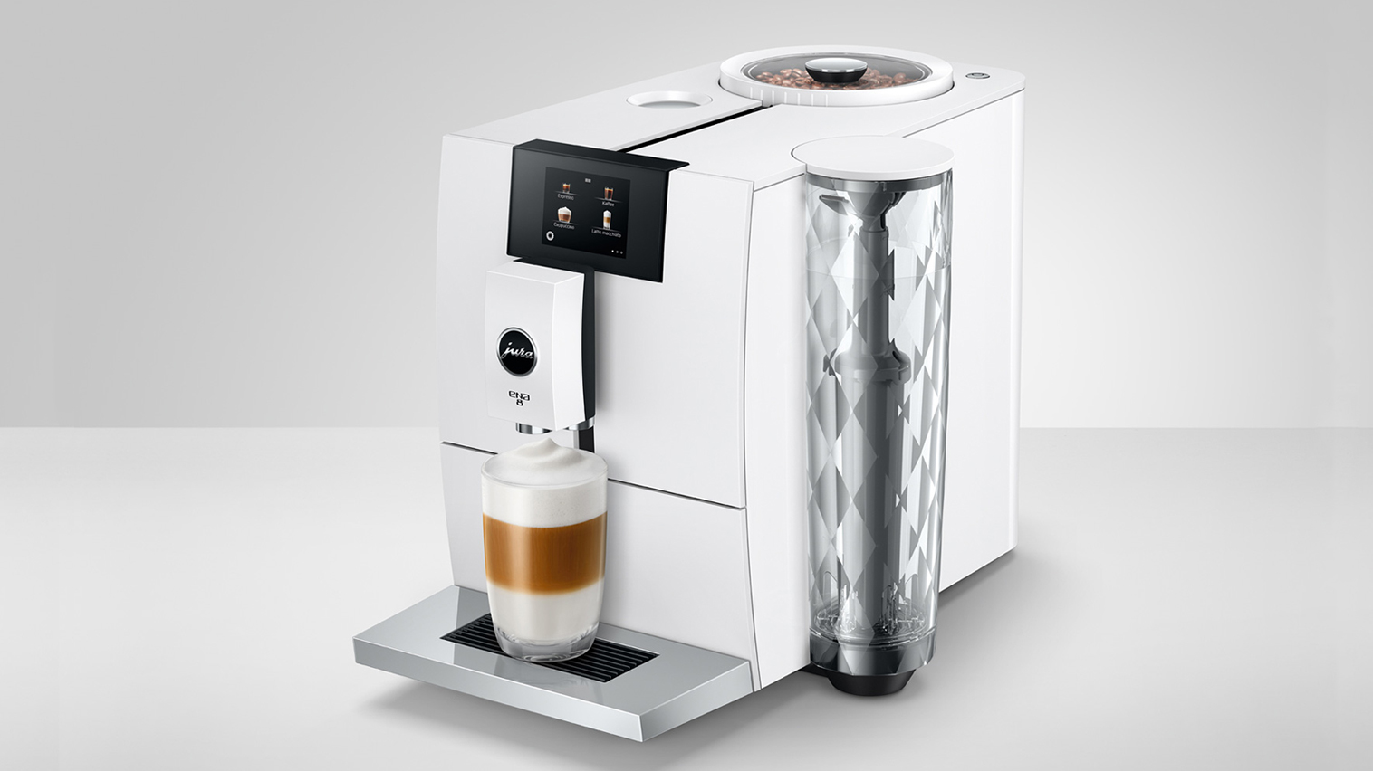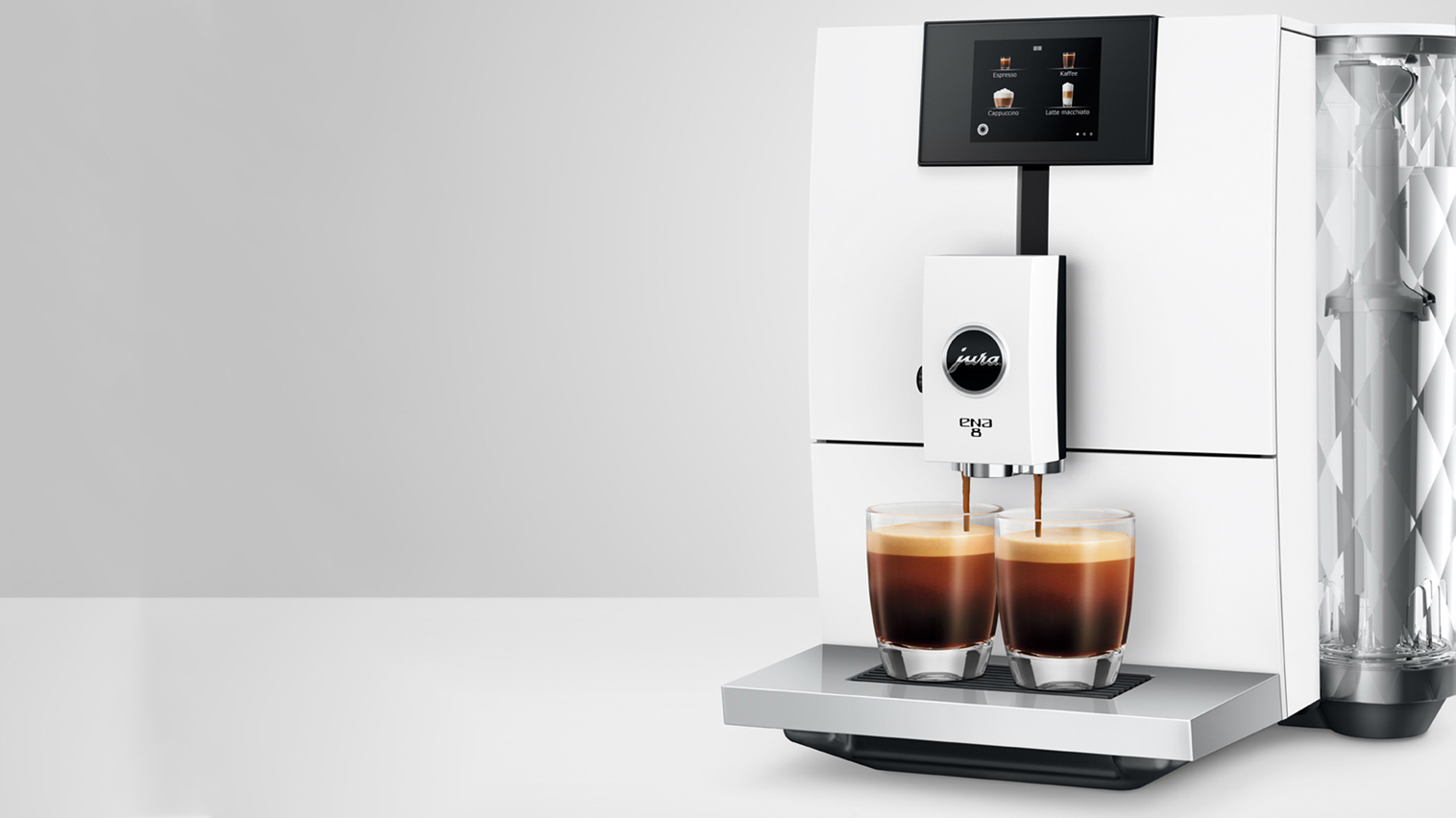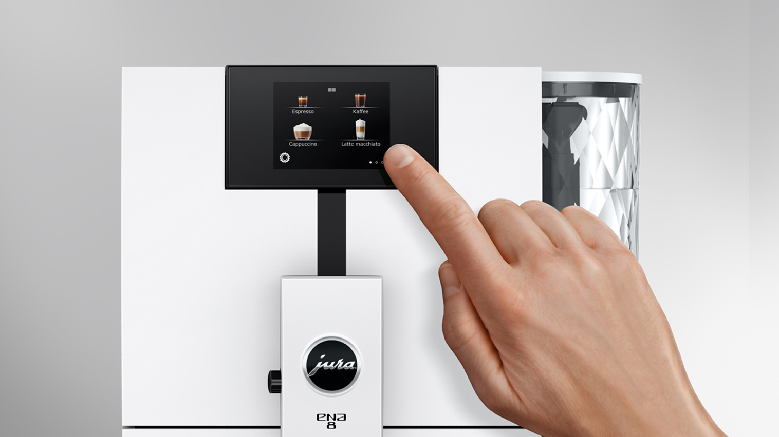 Jura ENA 8 (EC) Full Nordic White er en enkel, brugervenlig og utroligt elegant fuldautomatisk espressomaskine - nu med et lækkert, intuitivt touch display og helt sort kabinet.