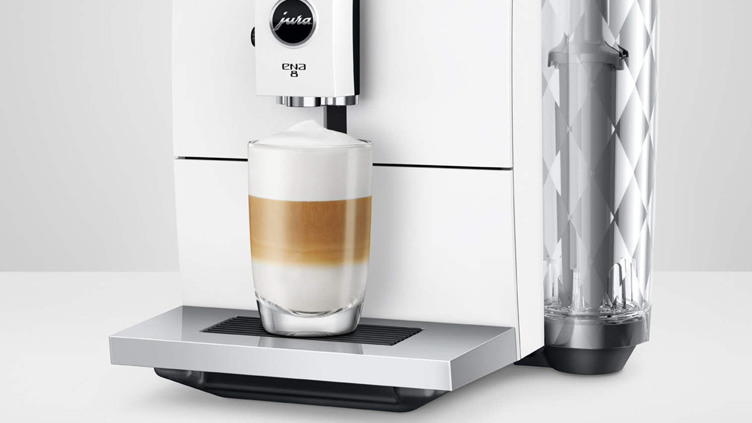 En speciel ting for Juras ENA 8 serie er, at serien er udstyret med den 360° runde vandtank. Strukturen på vandtanken kombineret med den cylindriske form er inspireret af elegante krystalkarafler, og du får derfor en vandtank, som glimter på fornemste vis og skaber referencer til diamanter.