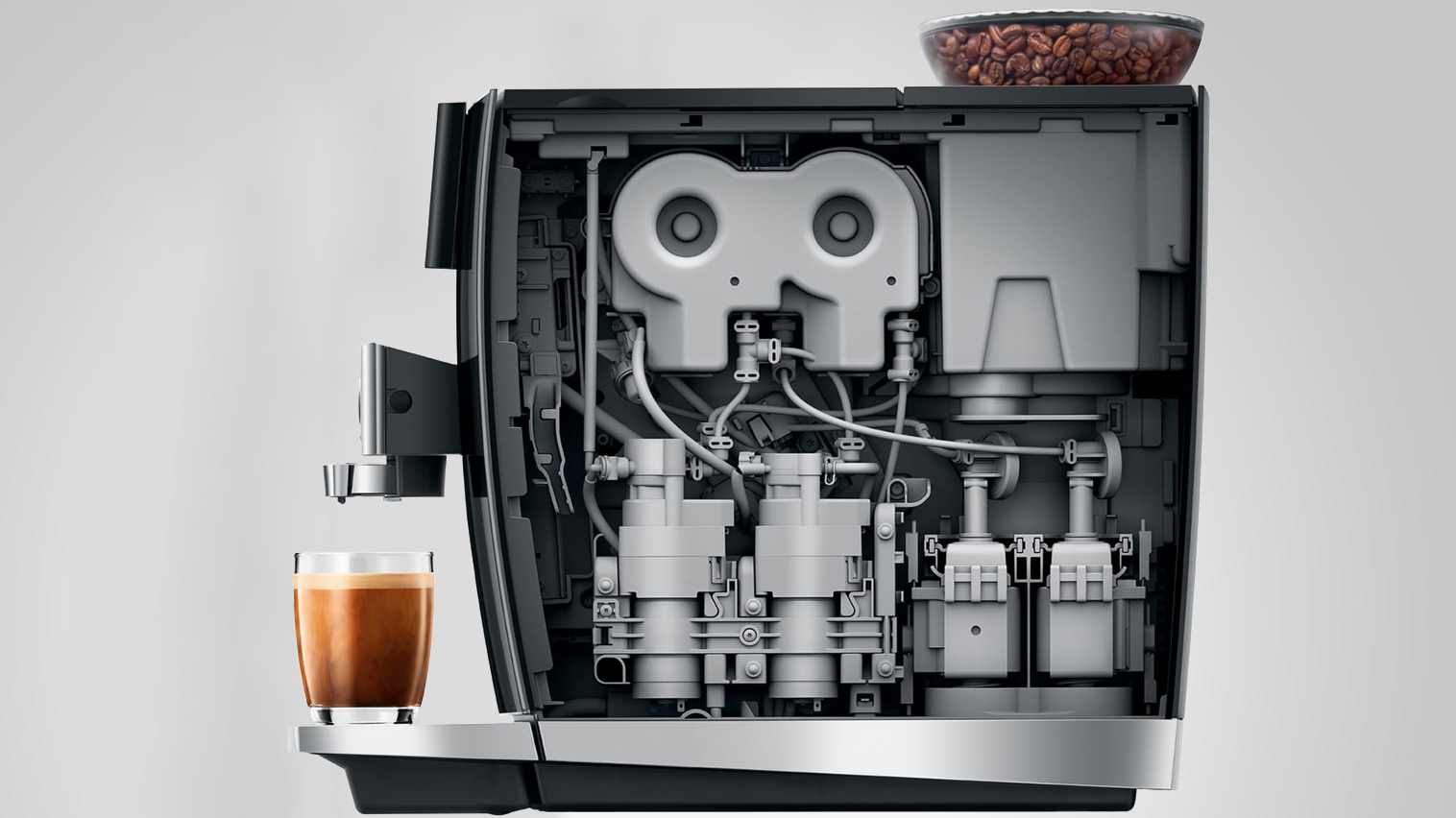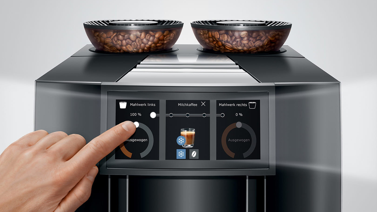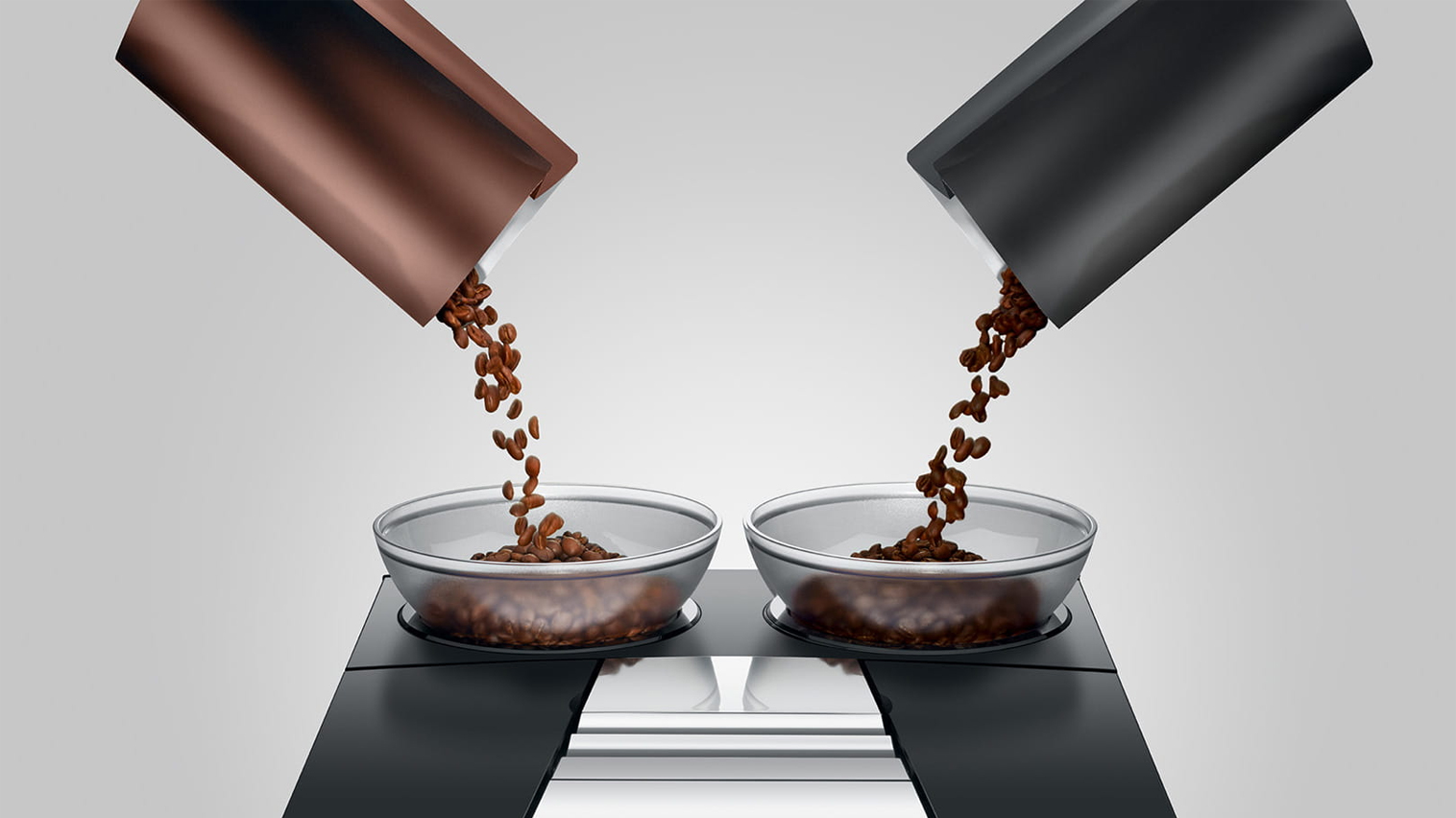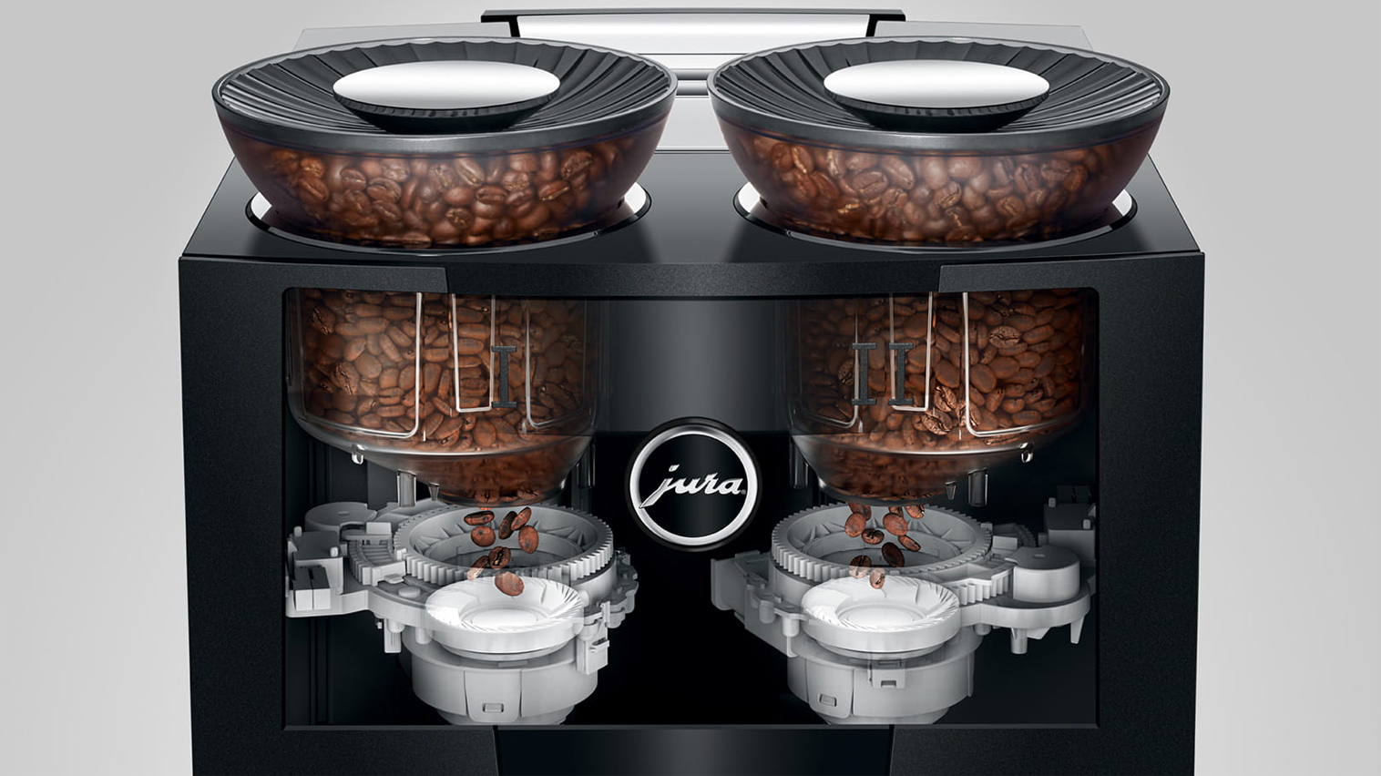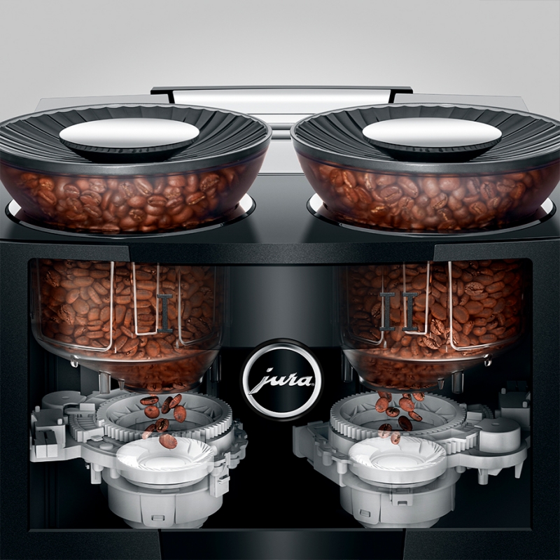 Maskinen er udstyret med to elektronisk justerbare keramiske kværne, to elegant designede bønnebeholdere, to pumper samt to termoblokke. Du får derfor en maskine som tilbereder dine kaffespecialiteter i ægte barista kvalitet, og hvor du har rig mulighed for at skifte mellem kaffeblends alt efter behov. Juras “Automatic Grinder Adjustment” (A.G.A) sørger for at kværnene leverer suverænt præcise resultater i hele levetiden.