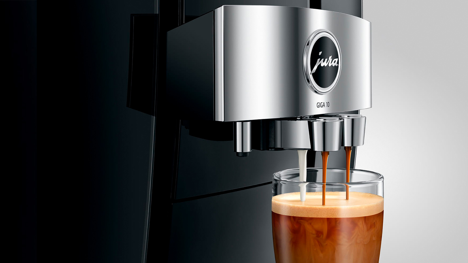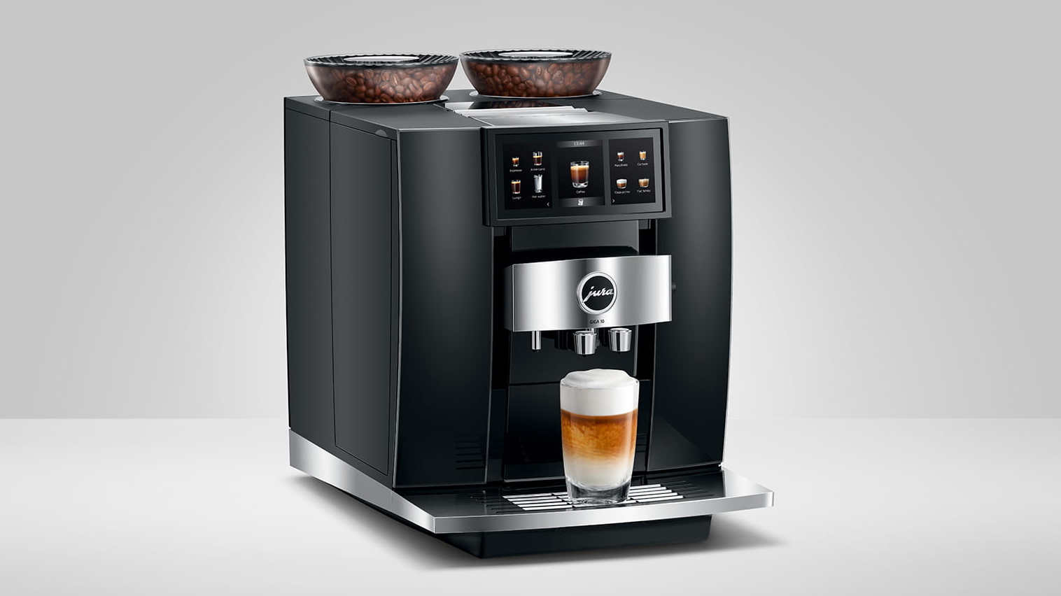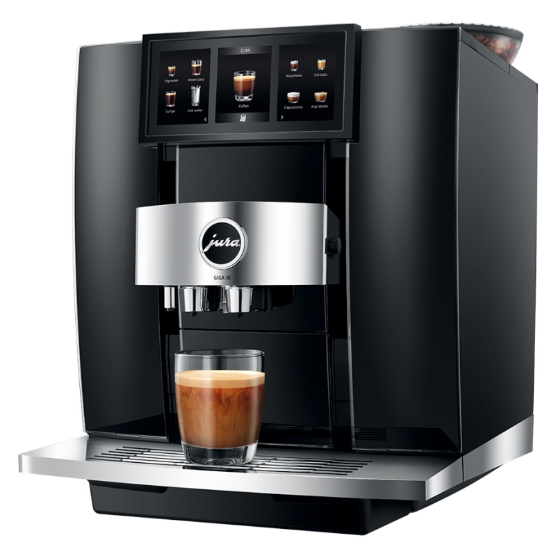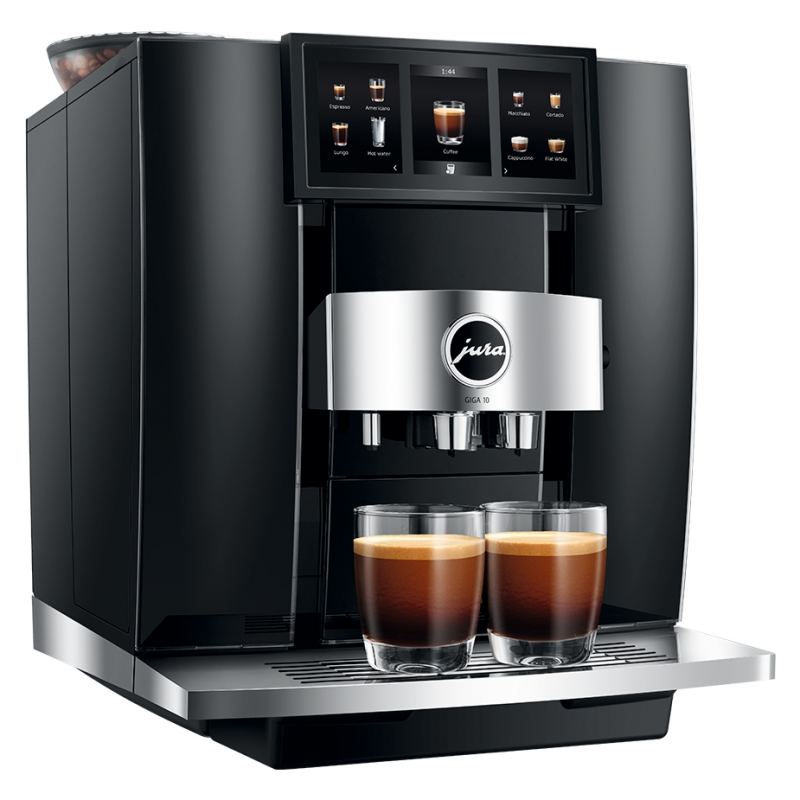 Med denne Jura Giga 10 (EA) får du en topmodel i et tidsløst, imponerende og eksklusivt design med luksuriøse materialer af høj kvalitet. Med sit frontpanel i elegant Diamond Black med kromelementer, det imponerende Panorama Panel og de to bønnebeholdere med deres turbinedesign, udstråler maskinen luksus og høj ydeevne.
