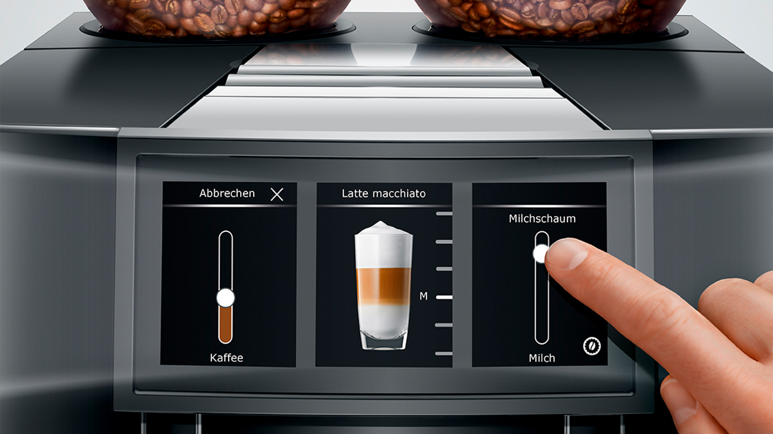Som noget helt nyt er Jura Giga 10 (EA) fremstillet med et eksklusivt Panorama Panel for intuitiv og overskuelig betjening. I Panorama touch panelet kan du nemt og hurtigt få et overblik over dine indstillinger samt produktindstillinger. Du navigerer let gennem de mange indstillingsmuligheder ved at trykke og slide dig frem og tilbage.