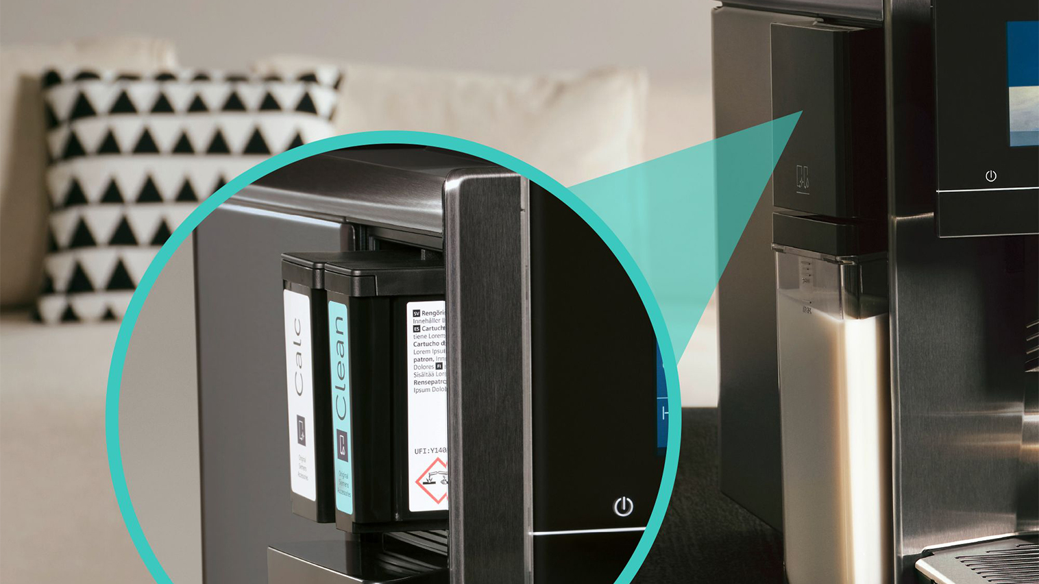 TQ905RZ5 EQ900 er udstyret med autoCalc'n Clean, som består af automatisk rengøring og afkalkning med indbyggede beholdere i maskinen. Dette system sørger for maksimal bekvemmelighed, hvor maskinen selv sørger for at både rengøre og afkalke. Maskinen meddeler, når der skal udføres en rengøring eller afkalkning, eller når patronerne skal skiftes.