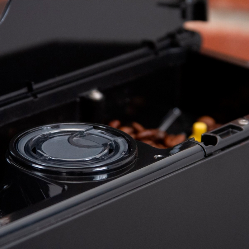 Den indbyggede bønnebeholder har en kapacitet på op til 250g hele bønner og er udstyret med et aromabevarende låg, så bønnerne holder sig friske. Har du brug for at brygge en kop kaffe med eksempelvis koffeinfri kaffe, kan du med fordel anvende formalet kaffe-funktionen, som gør det muligt at tilføje en skefuld malet kaffe.