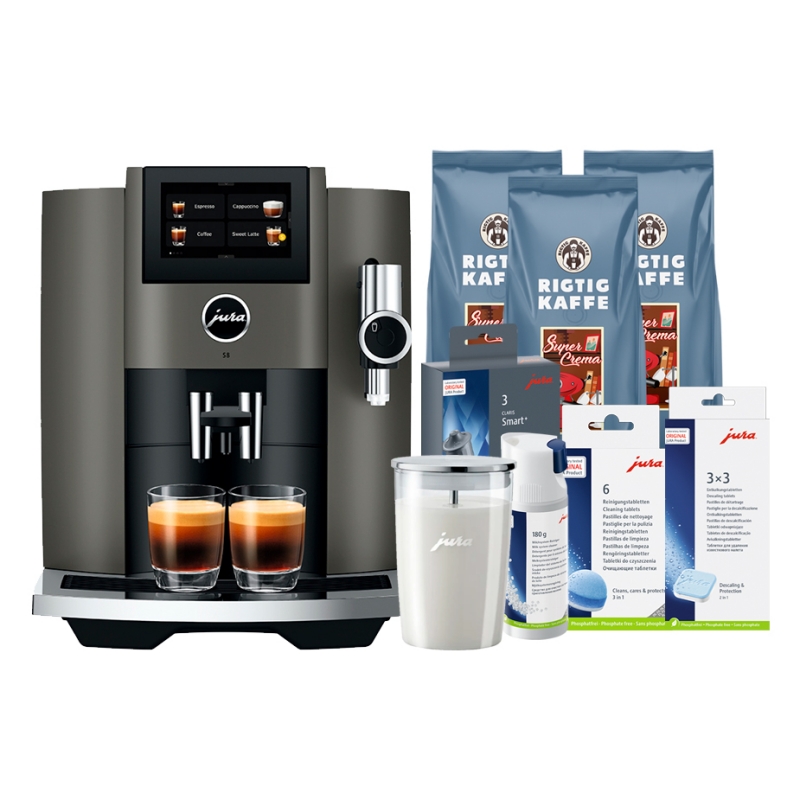 Jura S8 (EB) Dark Inox Espressomaskine Inkl. Pleje & 3kg Kaffe DK sprog