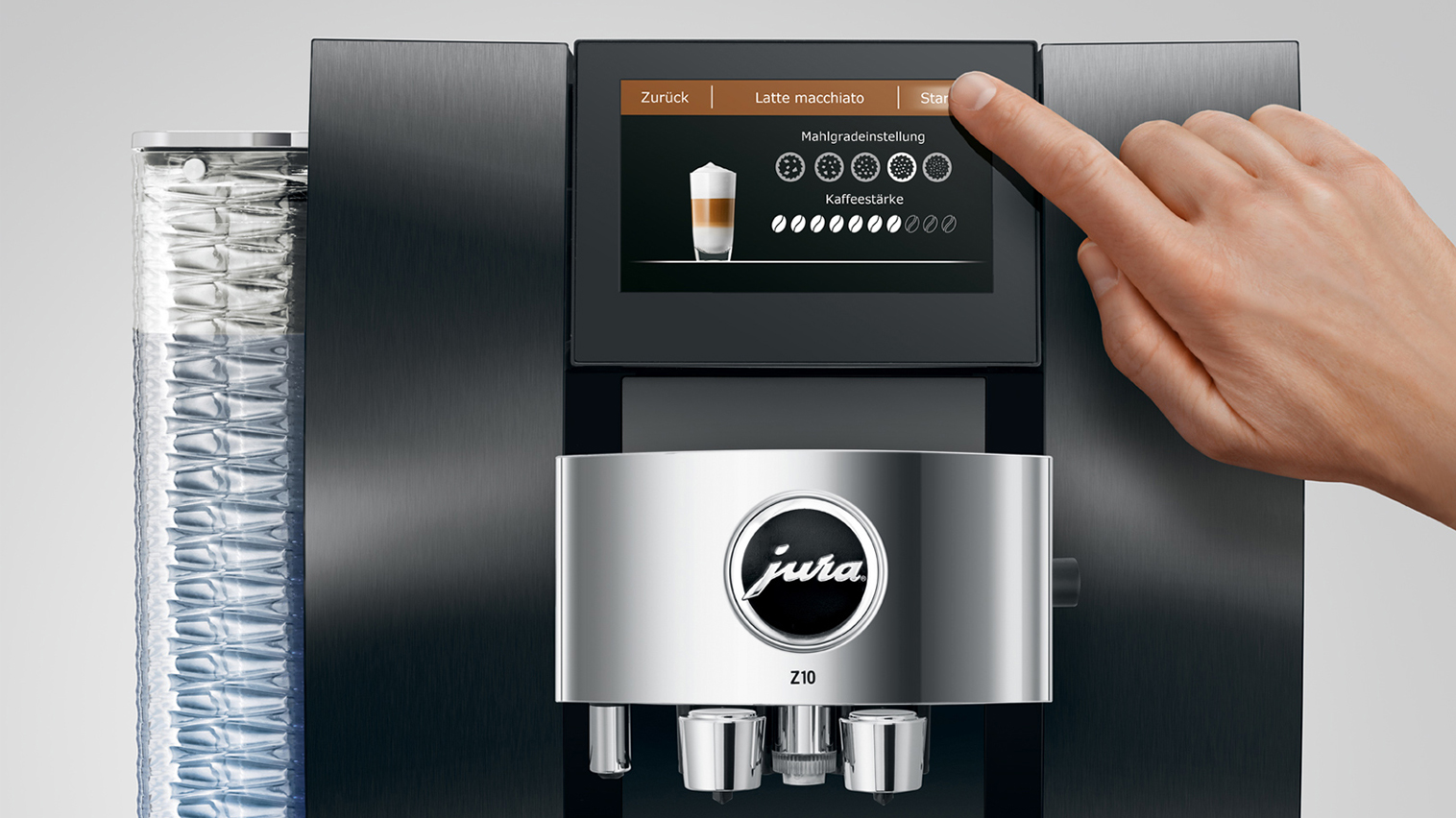 Jura Z10 er desuden udstyret med den helt nye Jura Product Recognising Grinder (P.R.G). Denne elektronisk styrede og højt ydende kværn justerer i en brøkdel af et sekund kværnens indstilling til den ønskede kaffespecialitet (bl.a til Hot eller Cold Brew). Spektret på kværnens indstilling spænder fra meget fint kværnet kaffe til de små kaffeklassikere såsom f.eks. espresso og til en meget grov indstilling til de koldbryggede kaffespecialiteter. Jura Z10 giver dig mulighed for at lave en lynhurtig automatisk indstilling af kværnen til hver enkelt kaffespecialitet. I fabriksindstillingerne for Z10 er den optimale indstilling på kværnen for hver enkel kaffespecialitet forprogrammeret.
