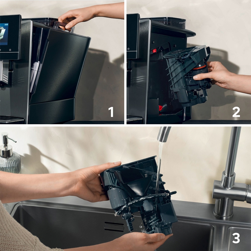 For hygiejnisk rengøring af bryggeenheden - den er nem at tage ud, skylle under vandhanen og sætte tilbage igen. Dette sikrer en vedvarende god smag og forlænger maskinens levetid. Så kan du nyde den rene aroma i den fineste kaffe.