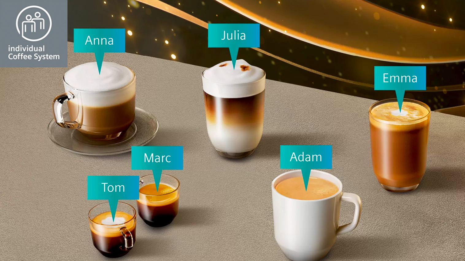 Med din EQ900 kan du gemme op til 10 drikke med dine individuelle indstillinger af kaffestyrke eller den mængde vand og mælk, du foretrækker. Ydermere er det endda muligt at indstille profilen som startkategori, så du har direkte adgang til dine favoritter, så snart maskinen er tændt.