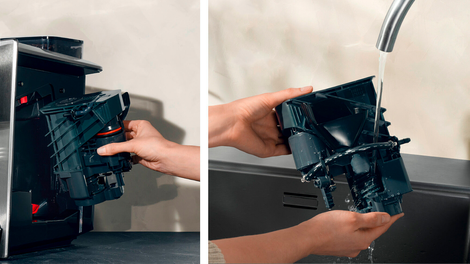 For hygiejnisk rengøring af bryggeenheden - den er nem at tage ud, skylle under vandhanen og sætte tilbage igen. Dette sikrer en vedvarende god smag og forlænger maskinens levetid. Så kan du nyde den rene aroma i den fineste kaffe.