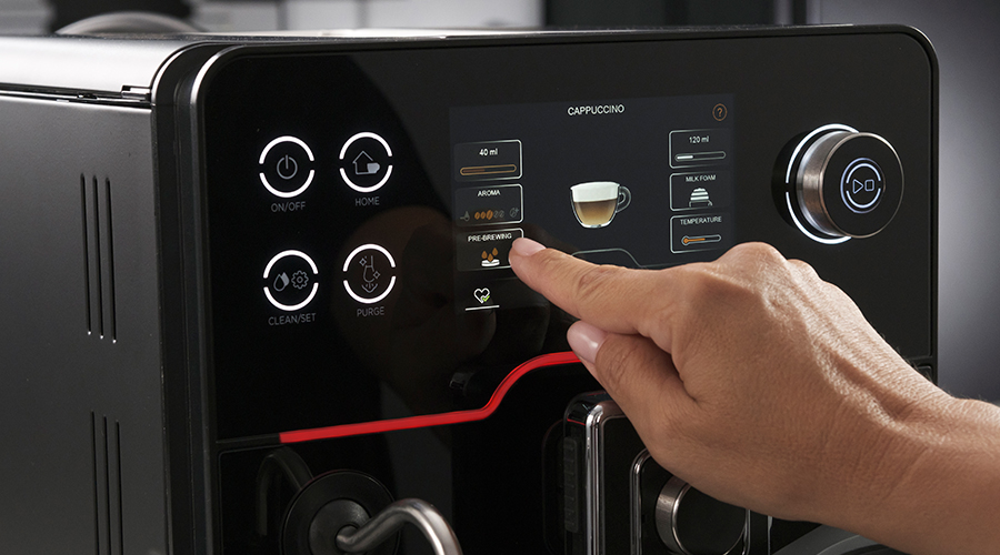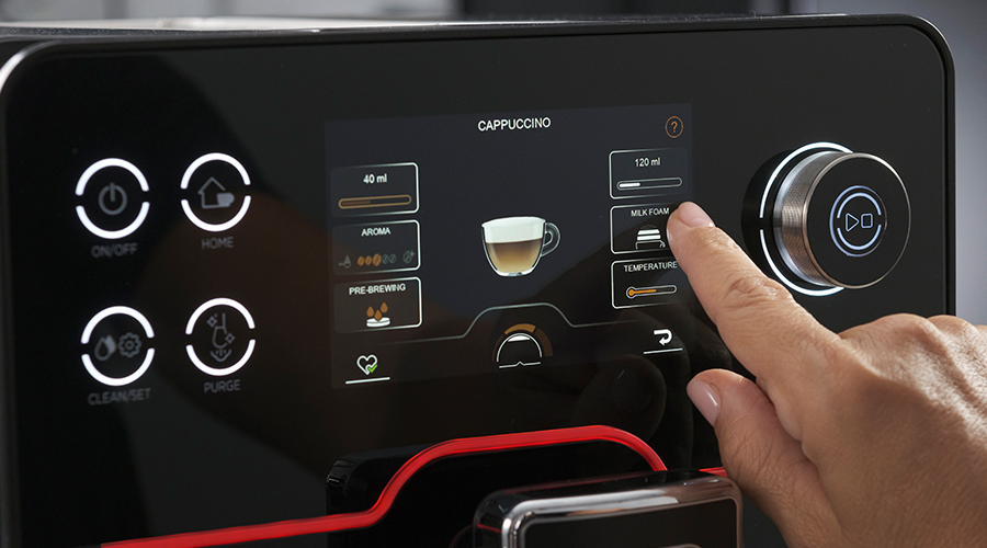 Maskinen er utroligt let at anvende takket være det nye intuitive og brugervenlige 5 tommer touch-display, der guider dig igennem ethvert forløb - uanset om du skal brygge kaffe- og mælkedrikke eller rengøre og vedligeholde maskinen. Ved siden af displayet finder du en drejeknap, som du også kan styre valg af kaffedrik med.