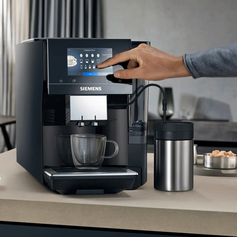 Siemens EQ700 espressomaskine giver dig altid den perfekte version af din yndlingskaffe. Maskinen er udstyret med det innovative og smarte 5-tommer touch iSelect display, hvor du med blot ét tryk kan vælge fra espressomaskinens menu og derefter finjustere efter din personlige smag ved hjælp af aromaSelect.