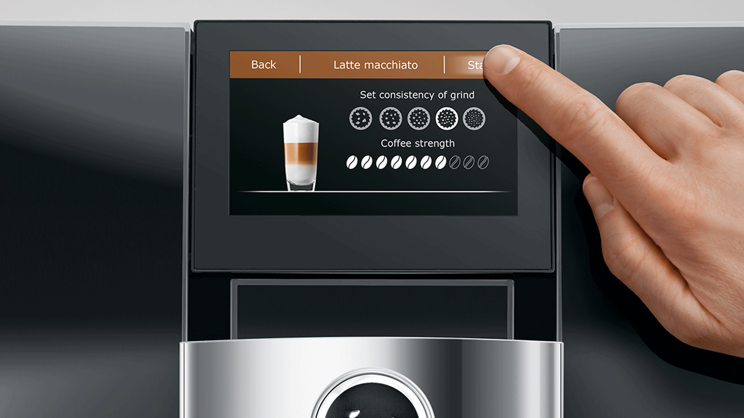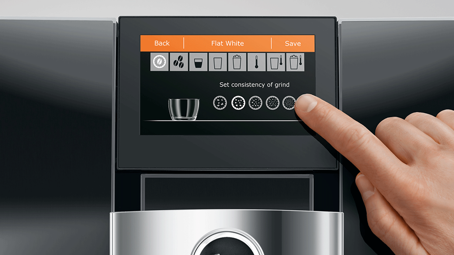 Denne espressomaskine kombinerer innovative og banebrydende teknologier med State-of-the-Art design og intuitiv betjening. Maskinen er udstyret med et "double-speed" 4,3" touch-display, en rotationshjul med blåt lys omkring, et skulpturelt design, 3 mm aluminiums front, bølgedesignet vandtank, symmetrisk topdesign og meget mere.