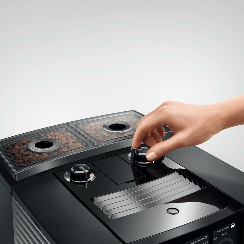 Jura J10 Twin er udstyret med to bønnebeholdere på hver 280g. Bønnebeholderne har en aktiv overvågning af mængden af bønner i espressomaskinen, så der altid er bønner nok til at brygge den ønskede mængde kaffe. Overvågningen sikrer, at kværnene aldrig kører tom.