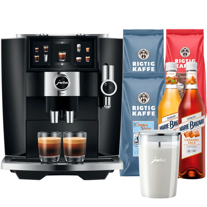 Tilbehør passer til Jura J8 Twin (EA) Diamond Black Inkl. Startpakke, Mælkebeholder, 3kg Rigtig Kaffe, Hasselnød & Saltkaramel Sirup