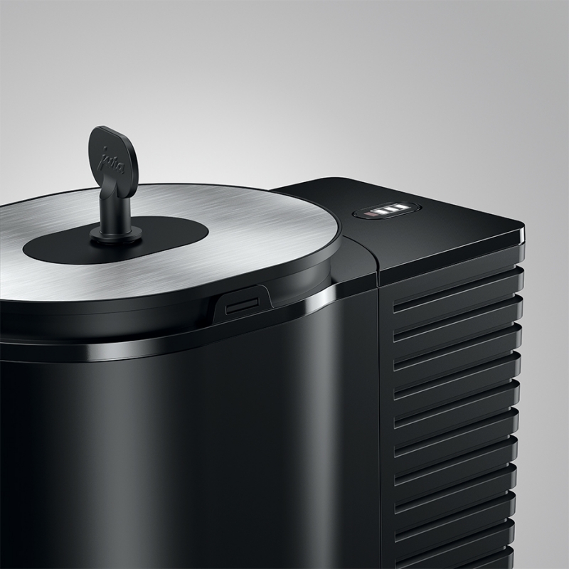 Jura Cool Control har en niveau-indikator i låget, som viser, hvor meget mælk der er tilbage i beholderen, og om der skal fyldes mere på. Den aktuelle mælketemperatur vises desuden i displayet, så du altid er sikker på, at mælken er frisk og lækker. Låget er udført i 1,5 mm tyk, børstet stål med integreret låsemekanisme, som gør det muligt at sikre/kontrollere adgangen til opbevaringen og påfyldningen af mælk.