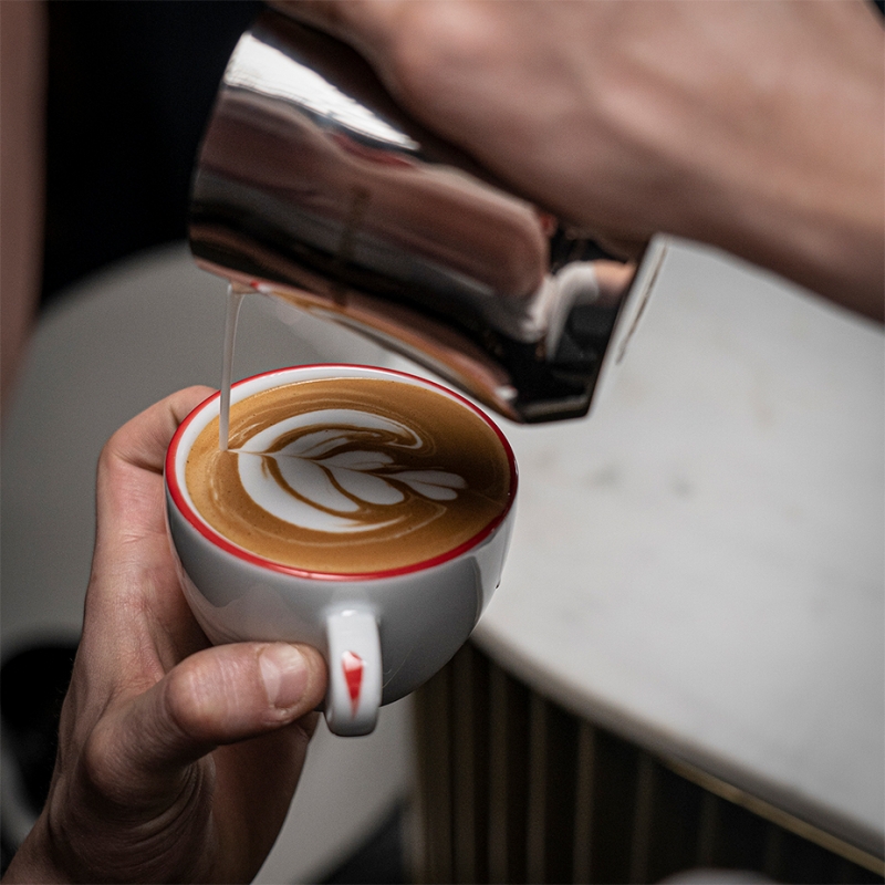 Lækre og elegante cappuccinokopper fra italienske La Pavoni. Cappuccinokopperne er lavet i hvidt porcelæn med røde detaljer og tilhørende underkop. Kassen indeholder 6 kopper med tilhørende underkop.