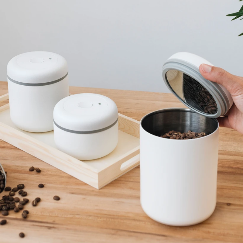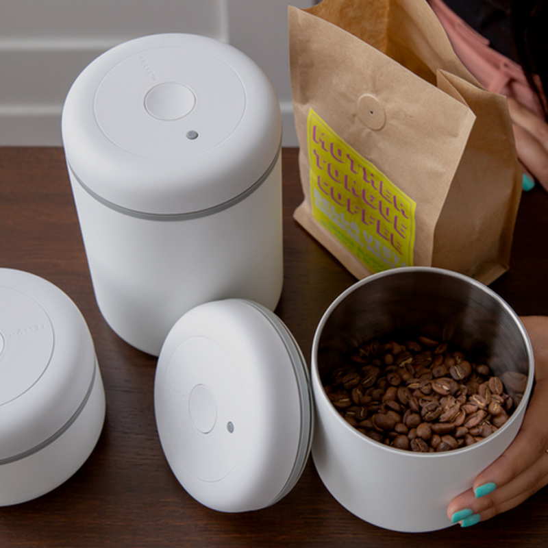 Fellow Atmos er en vakuumbeholder, der er lufttæt og forhindrer oxidation, som er med til at forlænge kaffens holdbarhed. Den store fordel ved denne beholder er den integrerede pumpe. Det fungerer ved at du drejer låget frem og tilbage for at fjerne luft indefra, uden at du behøver at bruge yderligere pumper.