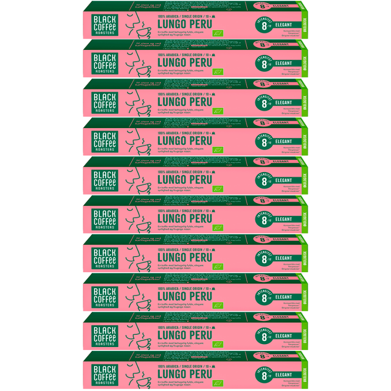 Black Coffee Roasters Lungo Peru er til store og små kaffeøjeblikke! Her får du en virkelig elegant kop kaffe. I denne pakke får du 10 x 10 stk.