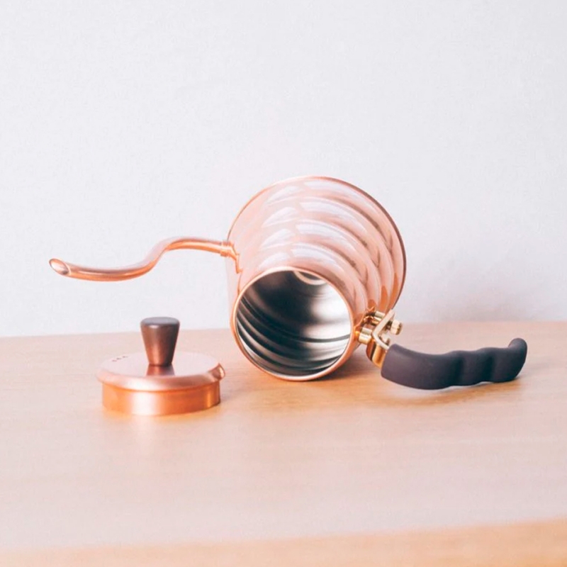 Hario V60 Buono kedlen i kobber er utroligt elegant og et perfekt værktøj, når man brygger "pour-over" kaffe, som ved V60.
