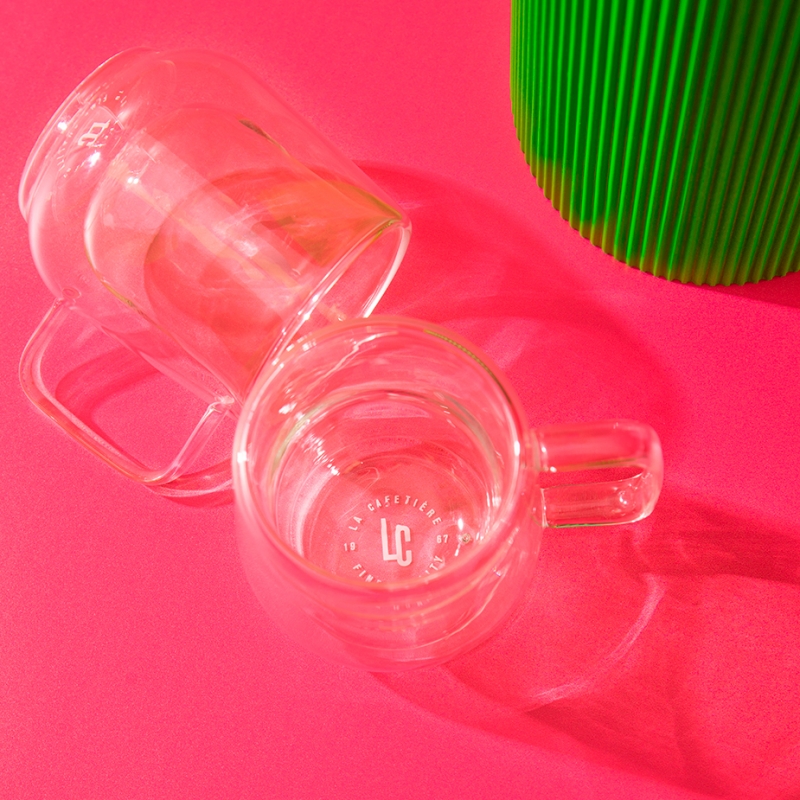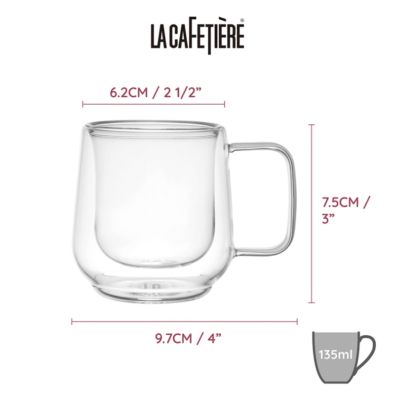 Slutteligt er glassene ergonomisk formet og udstyret med hank, så du får et behageligt greb. De kan matches med La Cafetières andre dobbeltvægget glas.