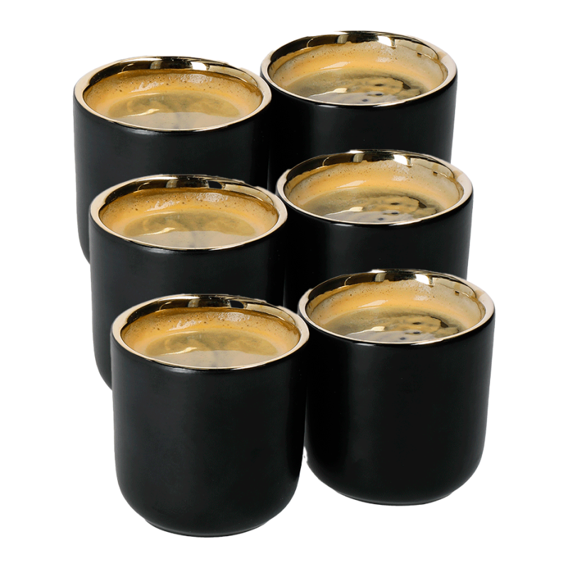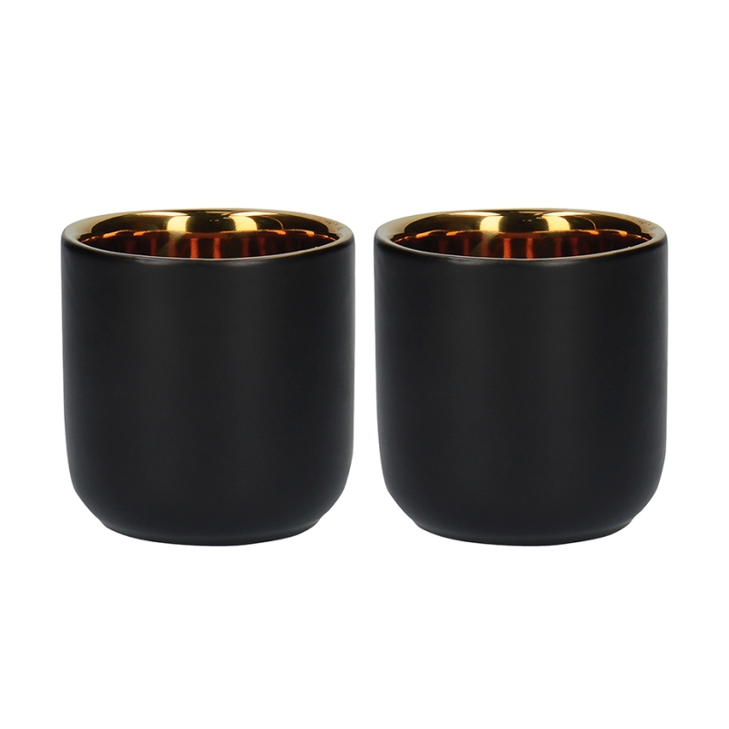 Espressokopperne er udført i stentøj, og er designet i en smuk farveblanding af sort og guld.