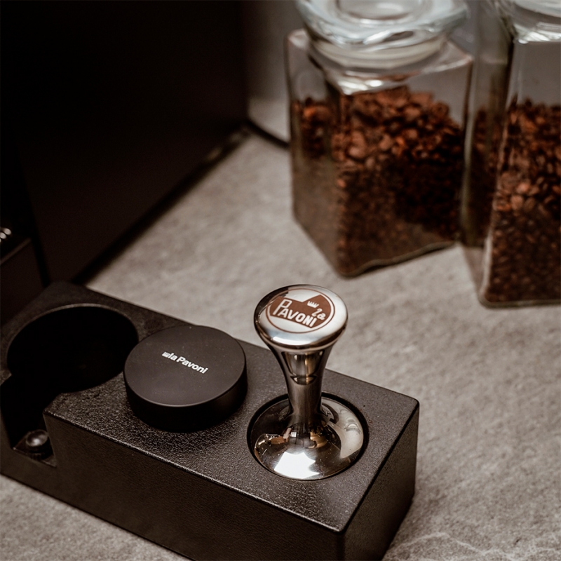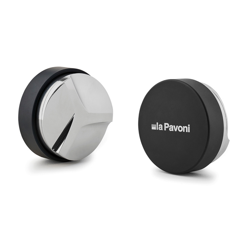 Denne kaffefordeler fra italienske La Pavoni er sort med hvidt La Pavoni logo, og passer til et 58 mm portafilter.