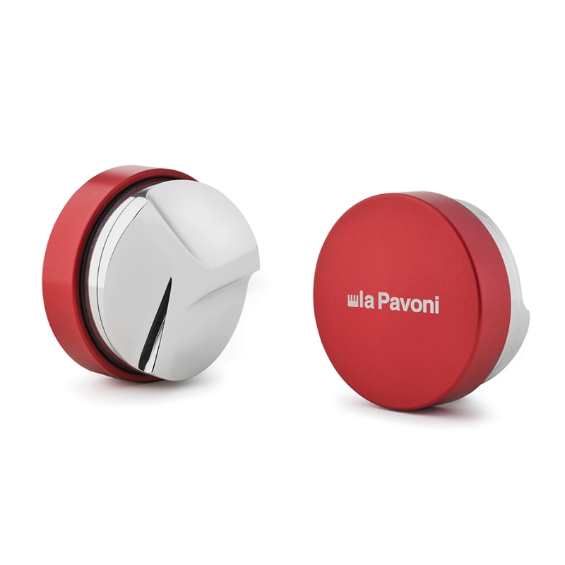 Denne kaffefordeler fra italienske La Pavoni er rød med hvidt La Pavoni logo, og passer til et 58 mm portafilter.
