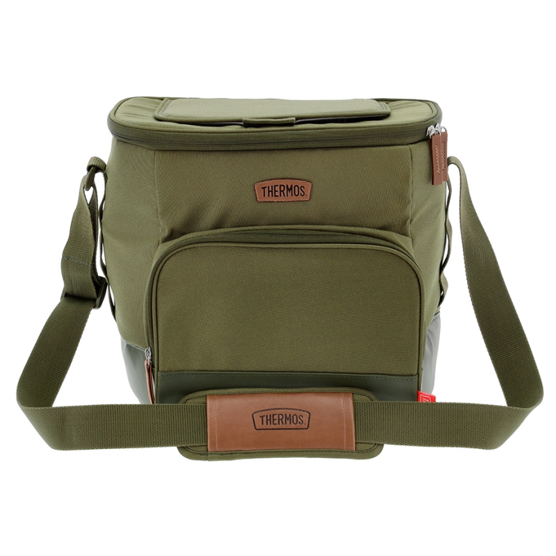 Denne køletaske fra Thermos har et stilfuldt design i sort holdbart stof med brune læderdetaljer og plads til op til 24 dåser.