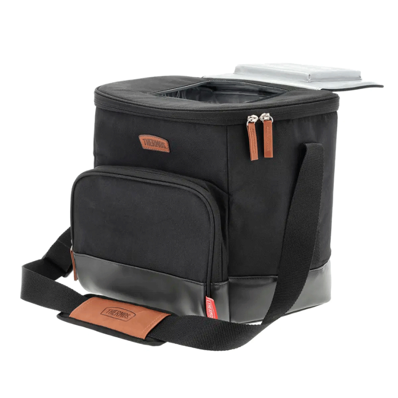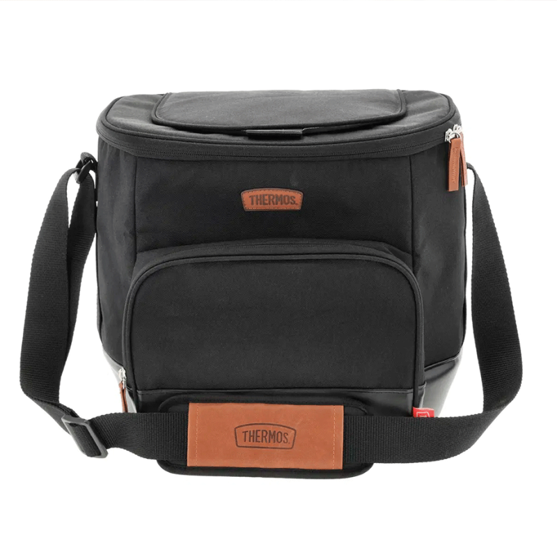Denne køletaske fra Thermos har et stilfuldt design i sort holdbart stof med brune læderdetaljer og plads til op til 24 dåser.