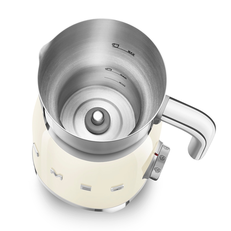 Smegs mælkeskummer anvender induktionsvarme til opvarmningsprocessen, og skummer tykt og lækkert skum til din varme kaffe eller kakao.