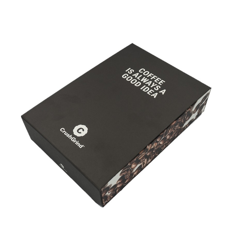 Gaveæsken er designet med CrushGrinds logo og tekst, hvor den er fremstillet med billede af friske kaffebønner på siden. Gaveæsken kan naturligvis også bruges til mange andre ting, alt efter hvad dit behov og ønsker er.