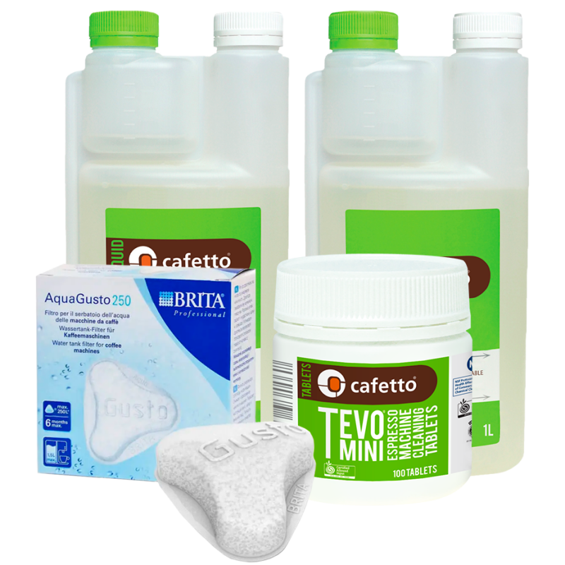 Plejepakke til Gaggia Classic indeholder alt hvad du skal bruge for at vedligeholde din semiautomatiske espressomaskine. Plejepakken indeholder mælkerens, afkalkningsmiddel, rensetabletter og kalkfilter.