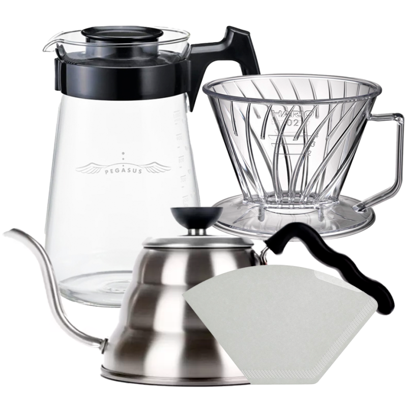 Hario Pegasus 02 Server 600ml Inkl. Papir Filtre 02, Plastik Dripper 02 & V60 Kettle Buono 100 1 L Stål