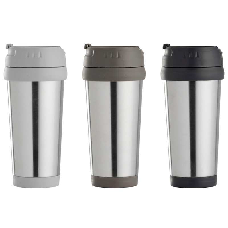 Lækkert termokrus i rustfrit stål med låg, der gør det nemt at nyde dine drikkevarer på farten.