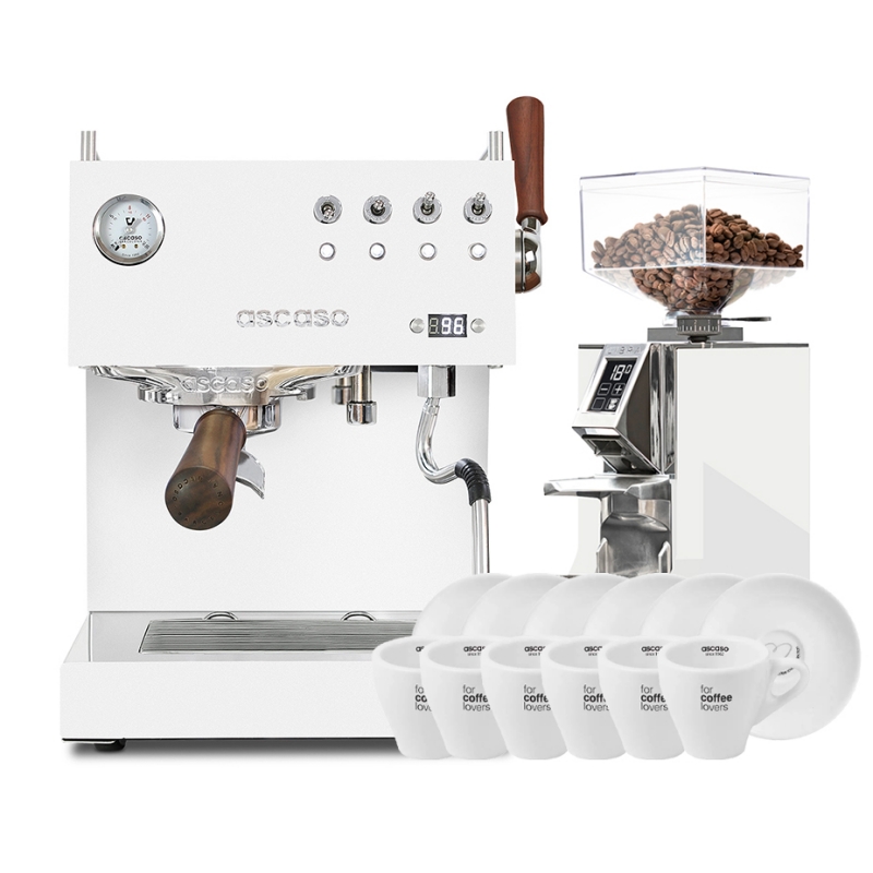 Tilbehør passer til Ascaso Steel Duo Plus White Espressomaskine Inkl. Eureka Mignon Libra Chrome/Hvid Espressokværn & Cappuccinokopper