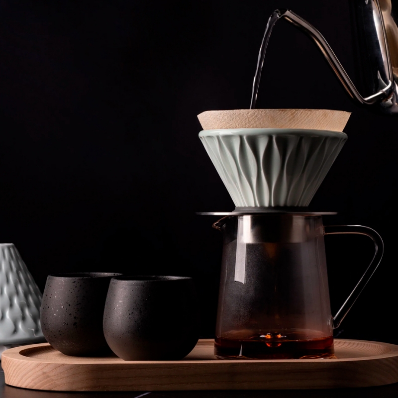 Flot dripper fra Japanske Hario i keramik i et klassisk og elegant design, der gør filterbrygning til en unik oplevelse. Her medfølger Loveramics Brewers Glaskande Tall på 500 ml af borosilikatglas.