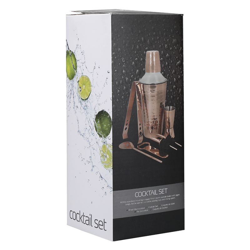 Alle dele er fremstillet i en smuk kobberfarve, og shakeren har et hamret finish for ekstra glimt. Sættet er fremstillet i rustfrit stål af høj kvalitet