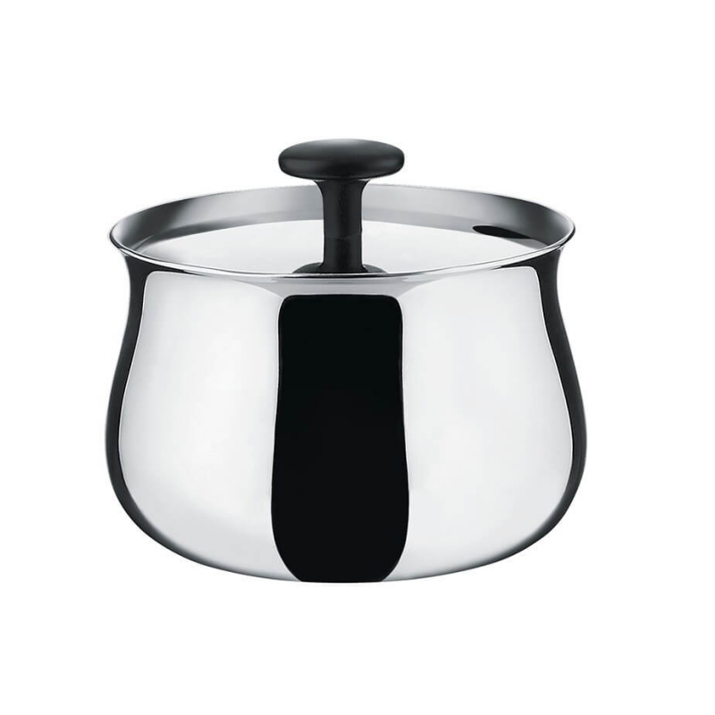 Sukkerskålen er designet i 2015 af japanske Naoto Fukasawa og er udført i 18/10 rustfrit stål, der fremhæver de flydende kurver. Formen giver desuden et fantastisk greb om skålen, og låget sikrer, at indholdet holder sig friskt. Der er selvfølgelig lavet et lille hul, så der er plads til en ske.