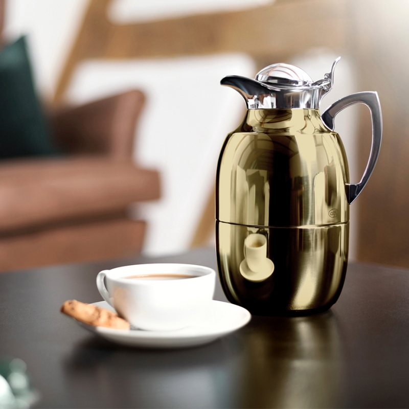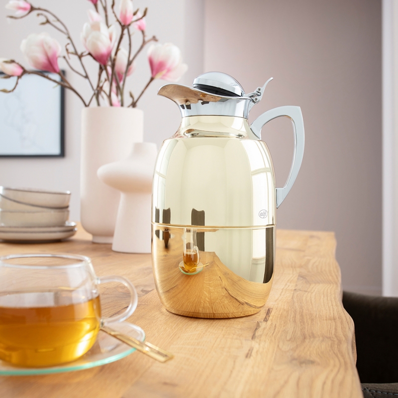Alfi Juwel er en smuk og robust termokande i en eksklusiv guld farve. Kanden er fremstillet af poleret rustfrit stål i høj kvalitet og kan betjenes med én hånd.