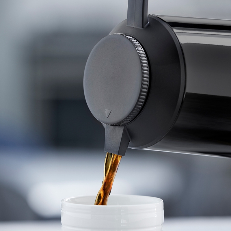Alfi Juwel er en smuk og robust termokande i en eksklusiv blank sort farve. Kanden er fremstillet af poleret rustfrit stål i høj kvalitet og kan betjenes med én hånd.