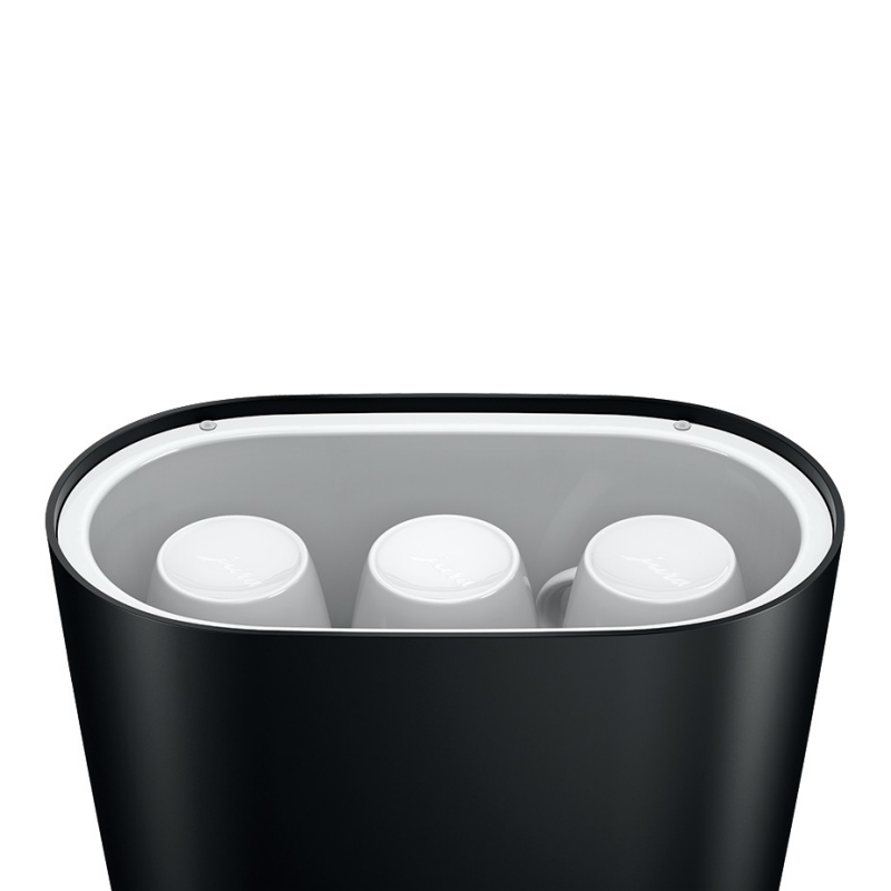 For at betjene kopvarmeren bruger du blot tænd/sluk knappen på fronten og åbner den foroven. Kopvarmeren har plads til 8 Jura espressokopper, 6 Jura kaffekopper eller 4 Jura cappucino kopper. Derudover vejer den kun lidt mere end 1kg, og den er derfor let at håndtere og bære.